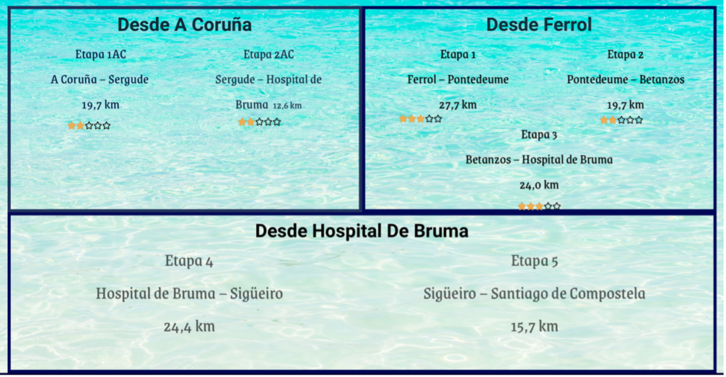 El Camino Inglés es la ruta jacobea que une los puertos de Ferrol y A Coruña con Santiago de Compostela. Su distancia por el ramal de Ferrol es de 112 km que pueden realizarse perfectamente en 4 o 5 etapas a pie, todas ellas bastante asequibles y bien señalizadas, por lo que resulta un recorrido muy apto para aquellos que sólo dispongan de una semana para escaparse a caminar, incluyendo los desplazamientos hasta el punto de partida y el regreso a casa.
